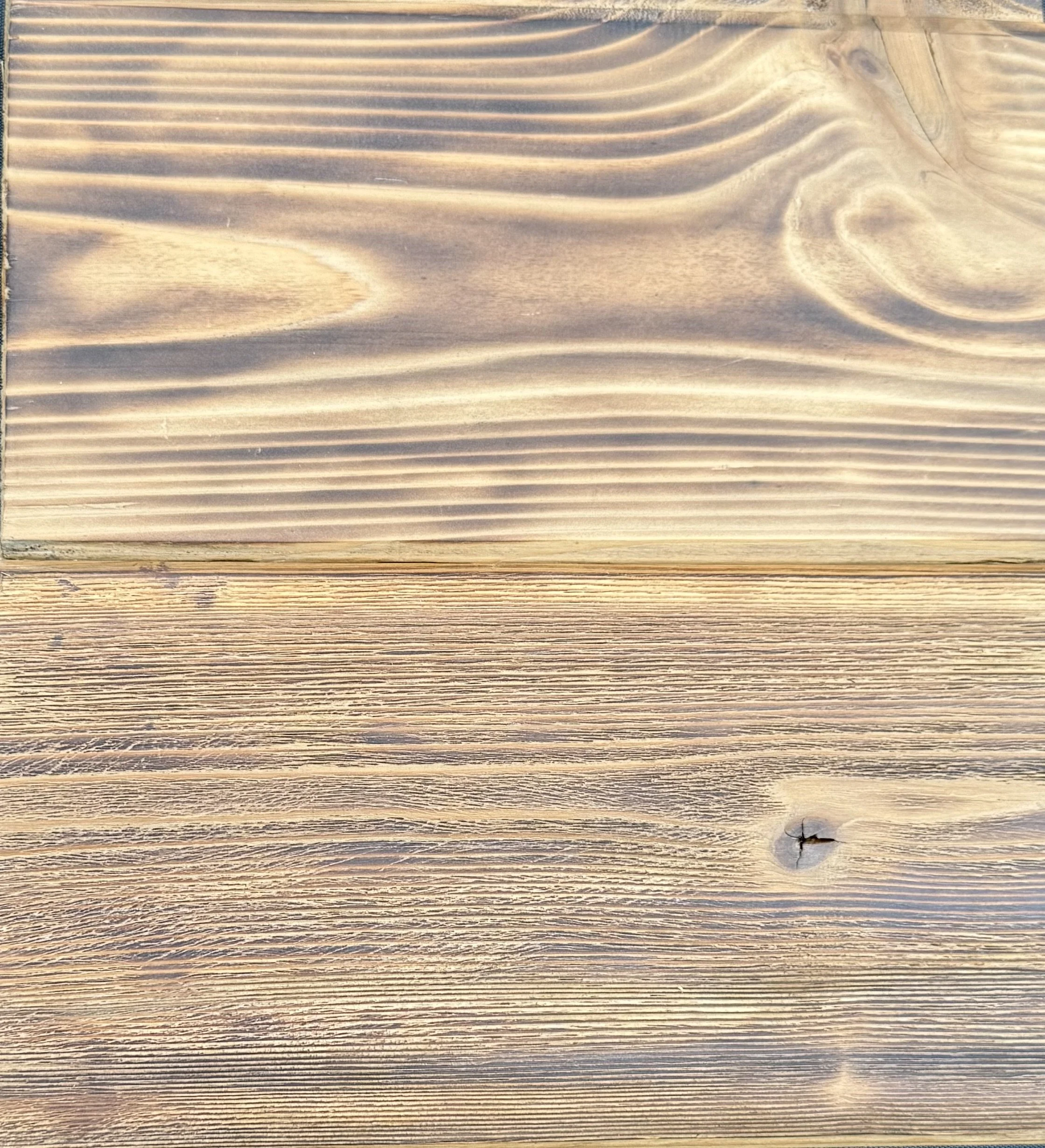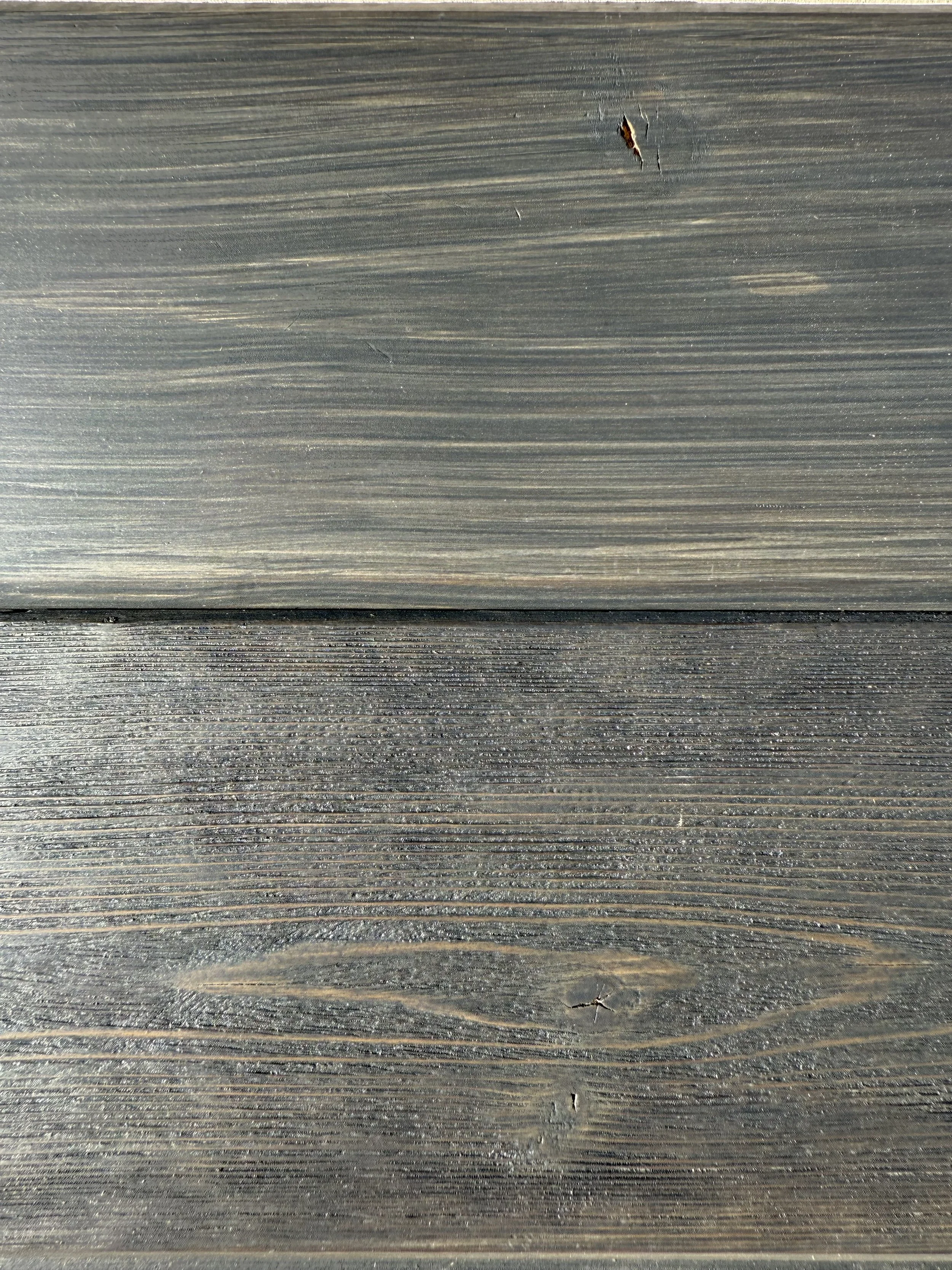 All samples shown are finished on cedar wood. Actual color and texture may vary depending on the wood species used. The Shou Sugi Ban process embraces the natural interaction between fire and wood, resulting in organic variations in tone, grain, and texture.